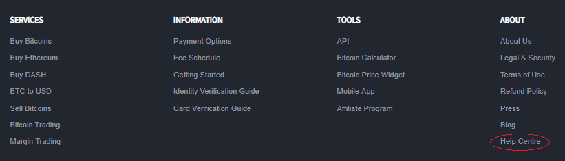 Em caso de qualquer problema com sua conta, a melhor maneira de entre em contato com a equipe de suporte do Cex.io está rolando para a parte inferior da página e clicando no link "Centro de Ajuda".