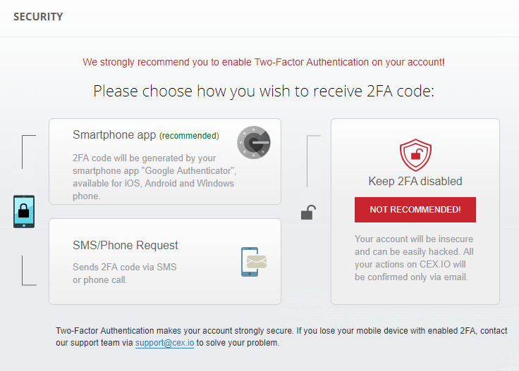 Cex.io é uma das trocas mais confiáveis após a Coinbase. Oferece proteção 2FA para as contas e recomenda que seus usuários a configurem. Não é possível fazer saques do Cex.io sem permitir 2fa. Além disso, a plataforma permite que os usuários criem Passcodes de retirada para melhor segurança.