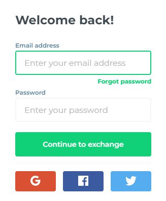 - Digite seu endereço de e -mail e senha e clique no botão "Continue até o seu Exchange". Não se esqueça de substituir a senha padrão (enviada a você pela Changelly após o registro) por sua própria senha forte para proteger sua conta. Para configurar uma senha forte, recomendamos você Visite este site.