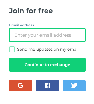 - Digite seu endereço de e -mail e clique no botão "Continue a trocar". (Como alternativa, você pode criar sua conta usando seu perfil existente no Google+, Facebook ou Twitter).