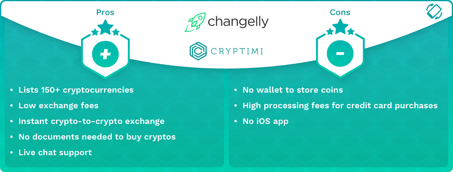 Como você leu nesta revisão Changelly, a plataforma é ideal para os usuários comprarem, trocarem e, no caso do BTC, vendem criptomoedas instantaneamente. Graças à sua direita processo de verificação, que não requer necessidade de fazer upload de documentos, leva apenas alguns minutos para comprar moedas digitais nessa troca. Embora seja cobra taxas altas para comprar criptos usando moeda fiduciária, o Taxas de cripto-para-cristão são muito razoáveis.