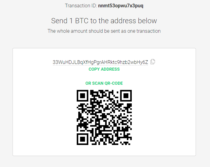 - Agora você verá o endereço da carteira da Changelly para a qual você deve enviar sua moeda digital. Você deve inserir este endereço para a coluna "destinatário" em sua carteira para enviar as moedas para Changelly. Se você possui um aplicativo móvel para sua carteira, pode digitalizar o código QR para inserir o endereço.