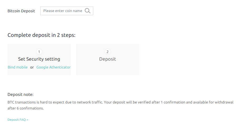 Antes de começar a negociar com Coinex, os usuários devem depositar qualquer criptomoeda como BCH, BTC, ETH etc. para compre outro altcoins ou tokens de criptomoeda. Além disso, os usuários devem depositar pelo menos a quantidade mínima de moedas mencionadas na seção "Taxas" (basta ver isso por rolando sua página de destino). São aproximadamente € 6 para o Bitcoin. Para depositar fundos: