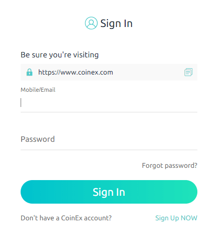 - Digite seu endereço de e -mail ou número de celular, senha e clique no botão "Assinar". (Devido a golpes de phishing, Coinex exibe uma mensagem solicitando que você Verifique duas vezes o URL você está visitando)
