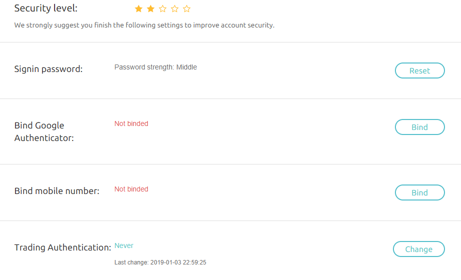 Como o Coinex é relativamente novo e nenhuma tentativa de hack foi feita até agora, até agora, pode ser considerado seguro. Embora a troca não forneça nenhum recurso de segurança avançado (como o monitoramento IP), ele fornece o Opção 2FA padrão Para proteger os fundos dos clientes. Além disso, utiliza fatores de segurança como estratégia de assinatura e HTTPs para fornecer proteção de dimensão total para os fundos dos clientes e Proteção de dados.
