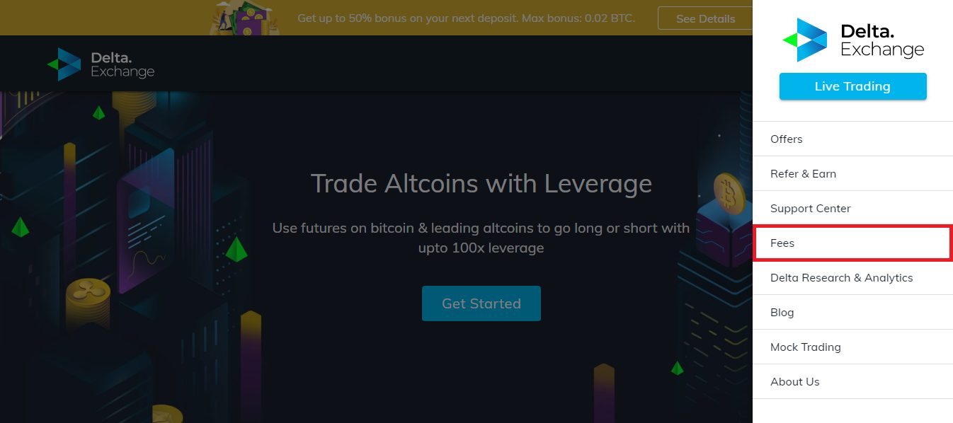 Ao fazer um depósito no Delta Exchange, verifique se há recompensas atuais, como bônus de depósito de correspondência. Para atrair mais usuários para a plataforma, a Delta está oferecendo periodicamente essas recompensas, permitindo que você negocie com capital muito mais alto.