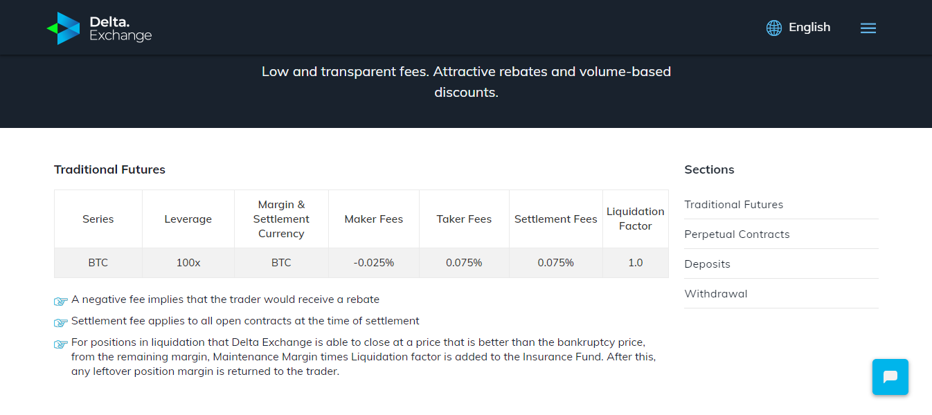 As taxas do delta são estruturadas De acordo com o derivado que está sendo comprado e vários outros fatores. Para os futuros tradicionais, a plataforma oferece uma taxa de fabricante e tomador de -0,025% e 0,075%, respectivamente. As taxas de liquidação do BTC são fixadas em 0,075% e os usuários podem acessar até 100x de alavancagem nas negociações.