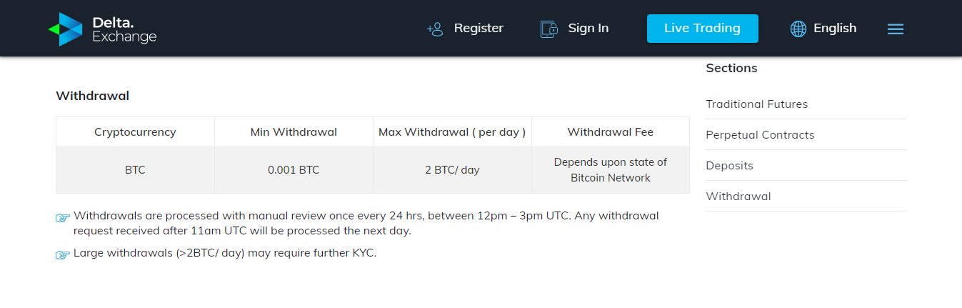 Desde a Delta Exchange não suporta moedas fiduciárias Ele é capaz de oferecer depósitos ilimitados e oportunidades de negociação aos seus usuários. Embora cada posição do contrato tenha um limite aplicável, não há depósitos ou saques máximos. Existe um valor mínimo de retirada de 0,001 BTC.