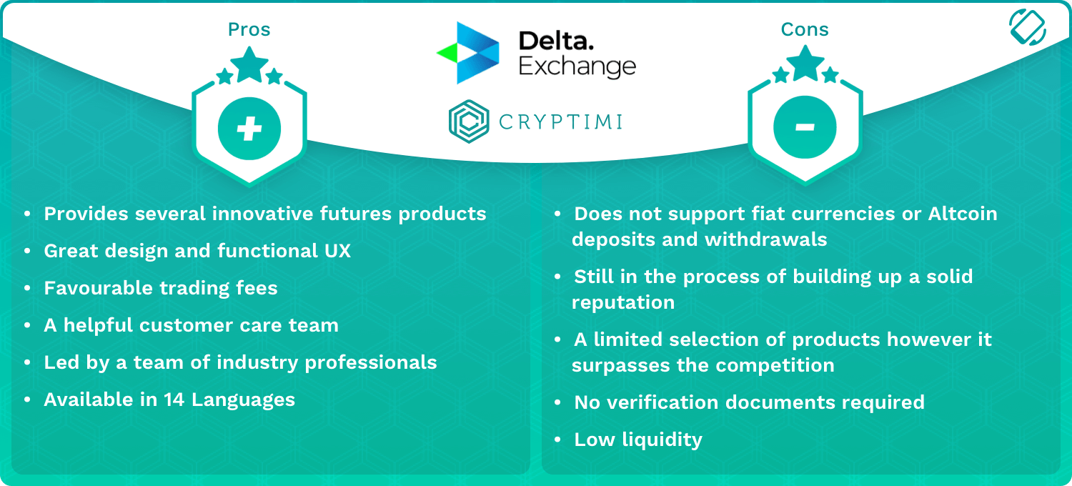 Esta revisão da Delta Exchange abordará os aspectos mais importantes da plataforma para ajudá -lo a tomar uma decisão informada. Embora estejamos atualizando continuamente nossas críticas de troca de criptografia, recomendamos que você sempre Visite o site da plataforma Para garantir que todas as informações ainda sejam válidas.