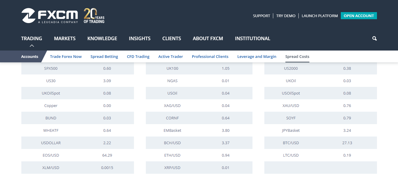 No caso das negociações de CFD, o FXCM não cobra nenhuma comissão. o Spread é a principal taxa de negociaçãoe pode ser facilmente calculado subtraindo o preço de venda de um contrato do preço de compra. Na realidade, essa taxa já está incluída no preço, e é por isso que é conhecida como uma citação "All-In". FXCM cobra parte do O menor CFD se espalha na indústria, mesmo que a gama de opções seja bastante limitada.