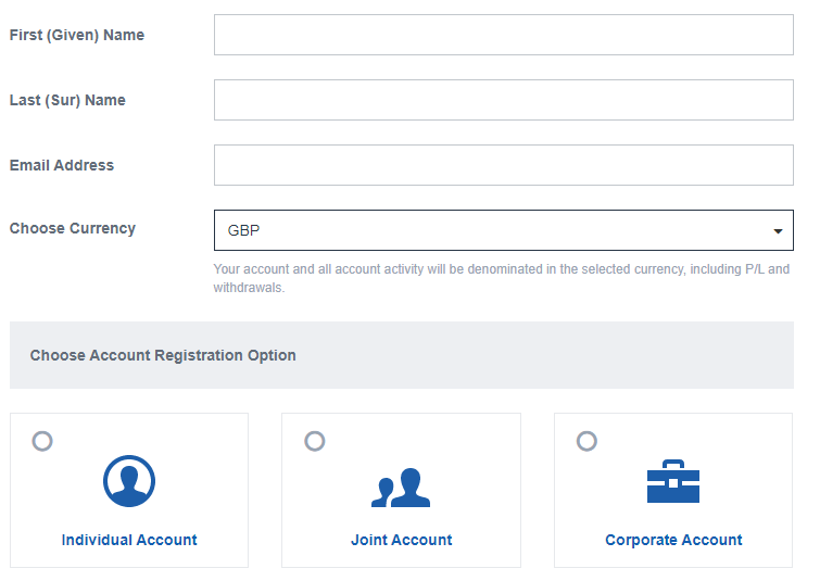 - Digite seus detalhes e selecione sua moeda base e tipo de conta