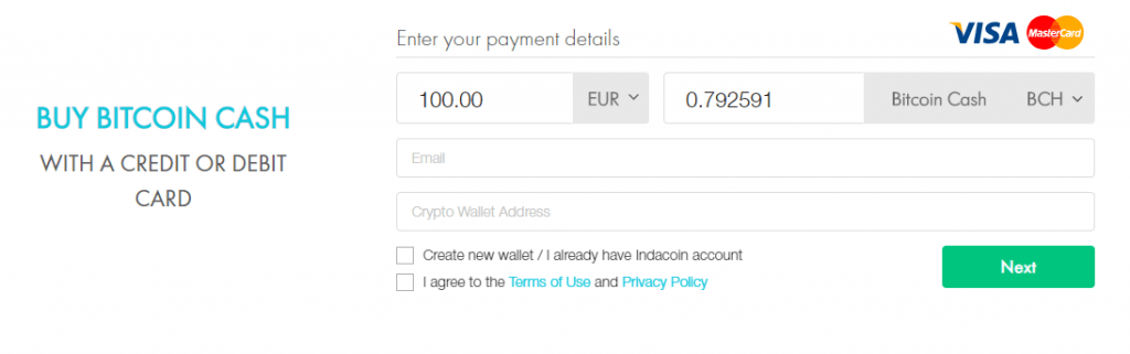 Siga as etapas abaixo para comprar o Bitcoin Cash (BCH) na troca do Indacoin usando um cartão de crédito ou débito: