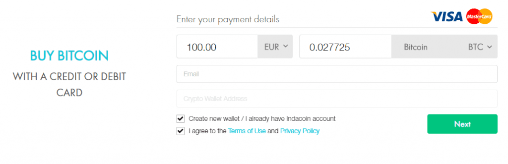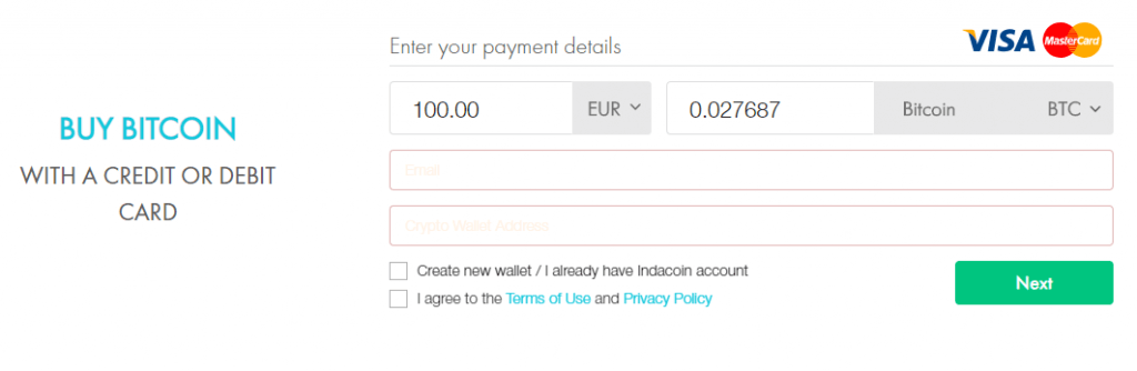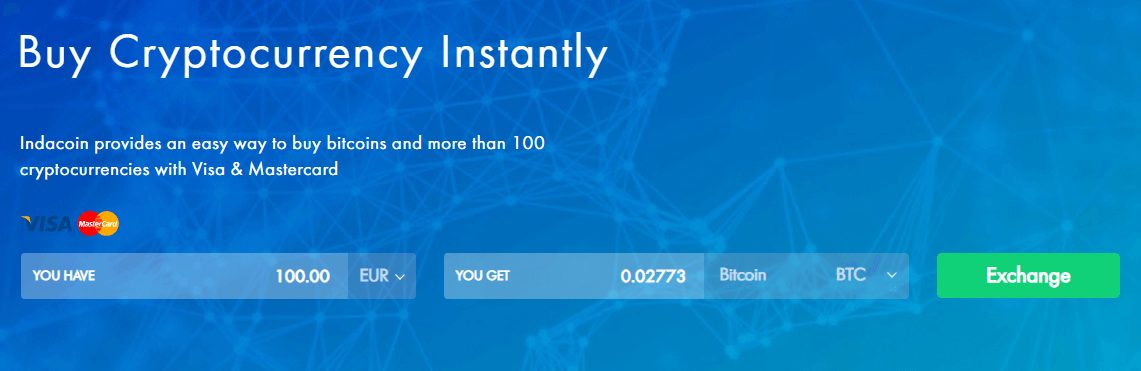 Indacoin é uma pequena troca de criptomoedas que é ideal para o investidor iniciante comprar rapidamente criptomoedas Usando seu cartão de débito de visto ou mestre. A maior vantagem do Indacoin tem em outras trocas é que o usuário não precisa criar uma conta.