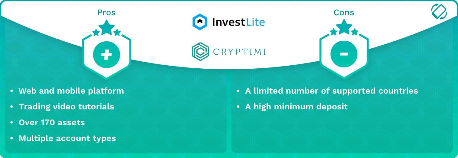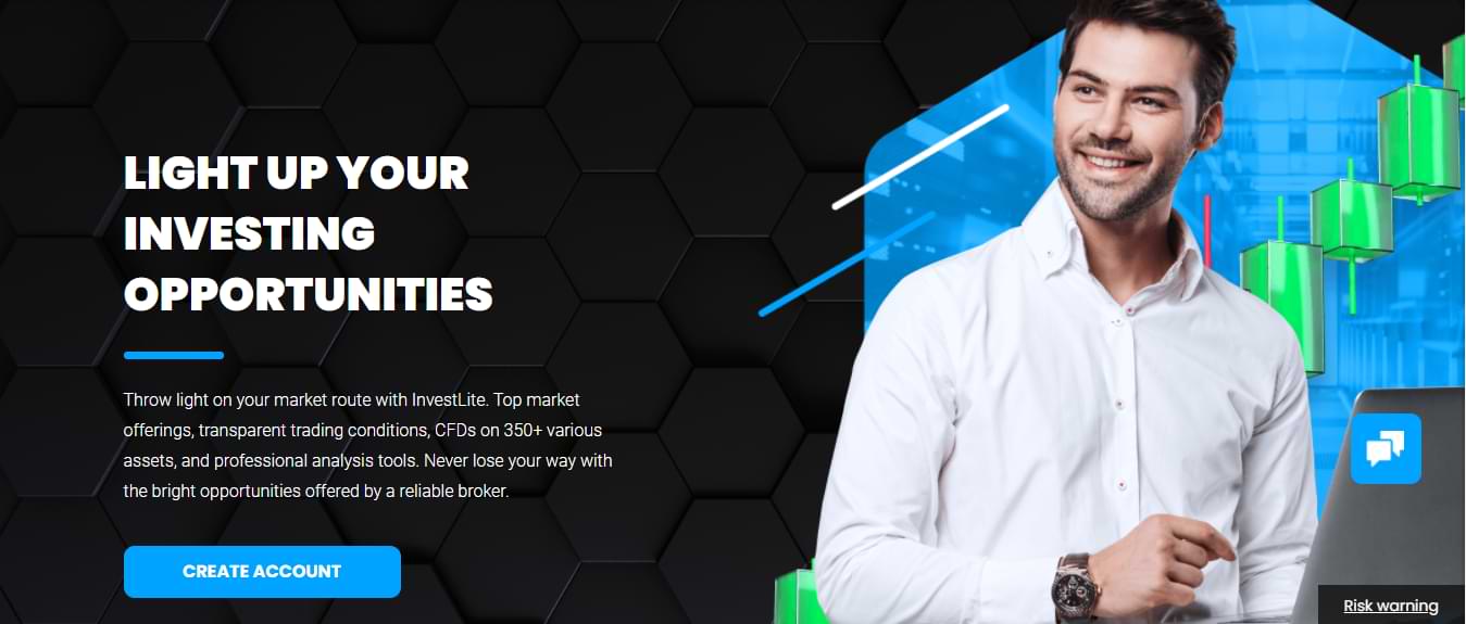 Investlite fornece uma boa base a partir da qual Novos investidores podem lançar suas operações. Oferece um bom equilíbrio entre opções funcionais e taxas competitivas. Você pode Invista em uma ampla seleção de Criptocurrency cfds bem como mercados alternativos, como mercadorias e ações. Os usuários são suportados por meio de suporte ao cliente e tutoriais em vídeo, tornando a Investlite uma boa plataforma de negociação CFD.
