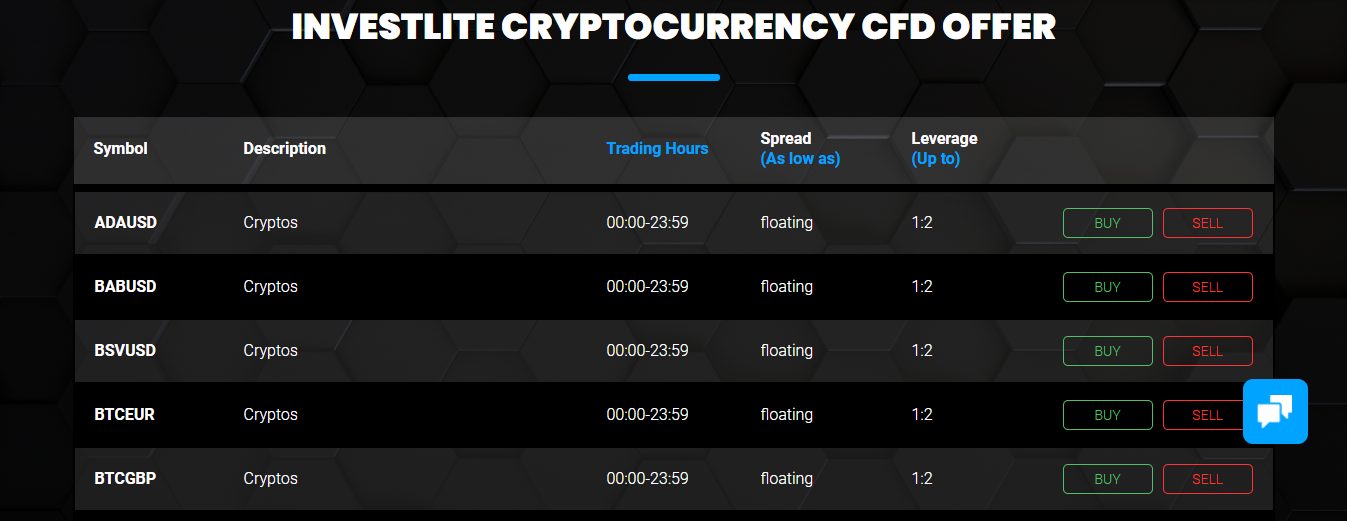 A plataforma não é uma troca de criptomoedas; portanto, você não pode comprar ou vender Bitcoin ou Altcoins. A Investlite é uma plataforma de negociação CFD, onde você pode comprar e vender derivados de criptomoeda.