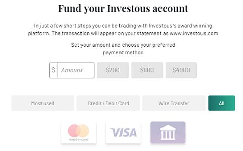 A Investous não cobra nenhuma taxa por depositar fundos na sua conta de negociação. No entanto, os saques estão sempre sujeitos a uma taxa que varia dependendo do método de pagamento e da moeda. Para cartões de débito/crédito, é 3,5% do seu valor de retirada.