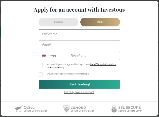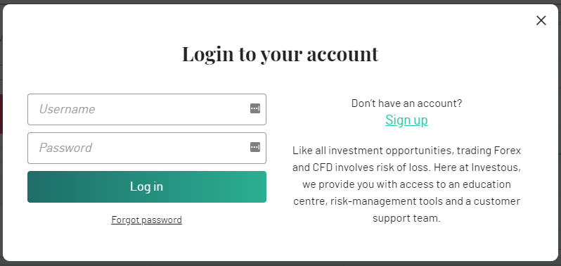 Para criar uma conta de negociação no Investous, você deve fornecer seu nome completo, endereço de e -mail e número de telefone. Caso você tenha esquecido sua senha, você pode redefinir isso clicando na opção "Esquecer senha". A plataforma Investous listou claramente todos os tipos de taxas em seu site.
