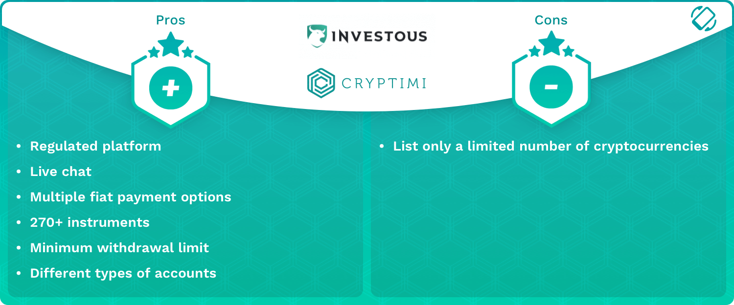Ambas as plataformas são regulamentado em todas as jurisdições Eles operam e permitem que os usuários negociem CFDs por criptomoedas de topo, incluindo Bitcoin, Litecoin, Ethereum e Ripple. Investous e Plus500 não cobram nenhuma taxa por fazer depósitos. No entanto, é aplicável uma taxa de retirada que varia dependendo do método de pagamento. Em relação à segurança, o Plus500 é considerado melhor, pois fornece 2FA Proteção Enquanto o Investous não fornece recursos de segurança adicionais no momento da redação.