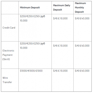 O valor mínimo de depósito para cartões de crédito ou débito e carteiras eletrônicas é 250 USD/EUR/EUR. Além do limite mínimo, o Investous também estabeleceu limites máximos de depósito como abaixo: