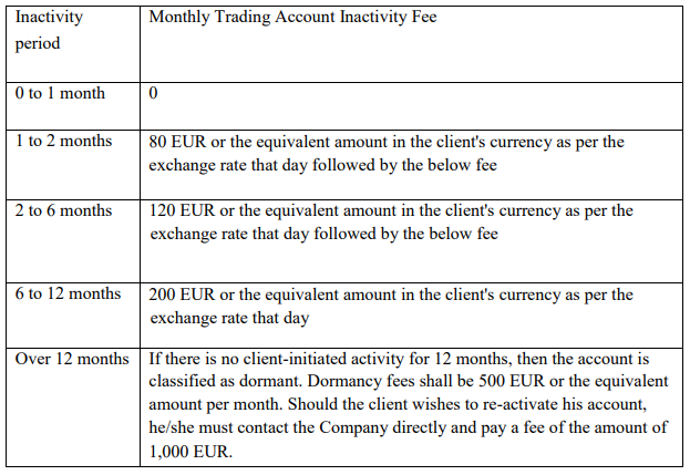 Se não houver transações em sua conta de negociação por um período de pelo menos 1 mês ou mais, uma taxa de inatividade de 80 EUR é aplicável. Essa taxa aumentará proporcionalmente se sua conta estiver inativa por uma duração mais longa.