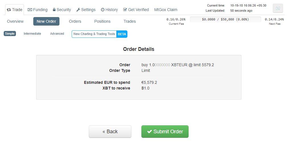 - Em seguida, clique no botão "Compre XBT com EUR". Você verá os detalhes do seu pedido na tela com dois botões 'Voltar' e 'Enviar Ordem'.