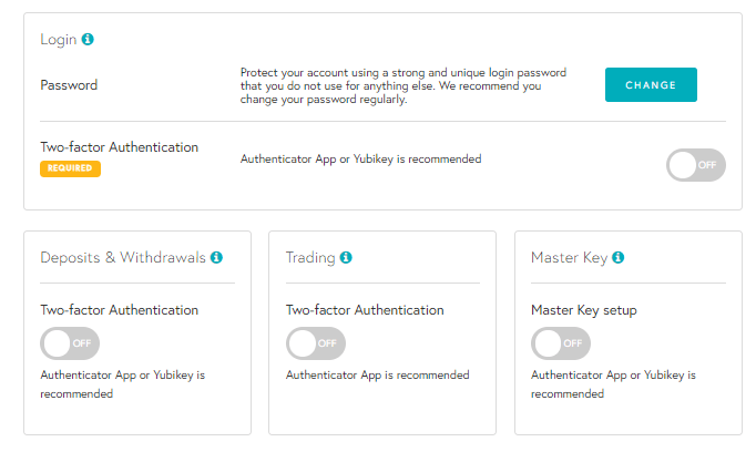 A Kraken Exchange visa fornecer proteção máxima às contas de seus clientes, aplicando vários fatores de segurança, como autenticação de dois fatores, chave mestre, bloqueio de configurações globais e senhas fortes. Dolorido Pode ser configurado usando o aplicativo Authenticator, Yubikey ou uma senha estática. A chave mestre é um recurso de segurança que pode ser usado para recuperar sua conta se você perder suas credenciais de login.