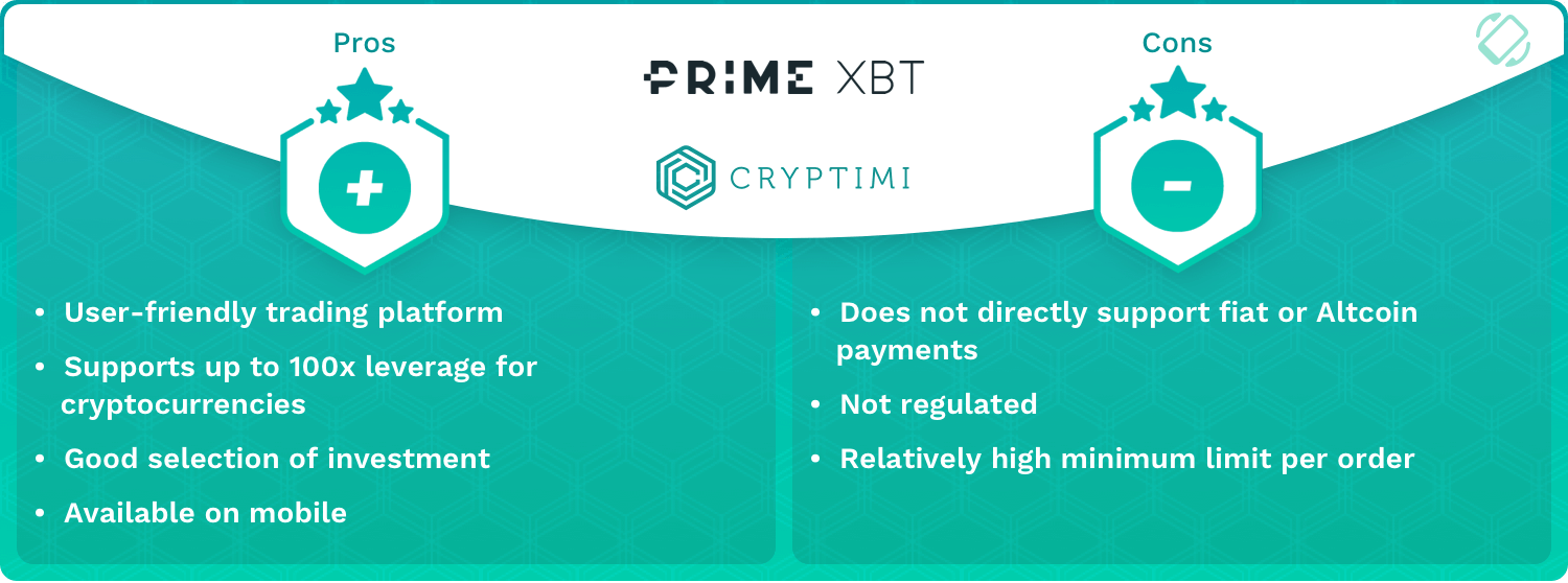 Como uma plataforma de negociação relativamente jovem e geralmente desconhecida, o PrimeXBT enfrentou uma batalha difícil para ganhar participação de mercado. Para atrair usuários, está oferecendo taxas competitivas e alavancagem surpreendentemente alta, não apenas em criptomoedas, mas também em outros mercados. No geral, a plataforma funciona bem e é altamente classificada. Embora não seja regulamentado, claramente deseja oferecer um serviço profissional e confiável, enquanto os usuários atendem a se identificarem necessariamente.