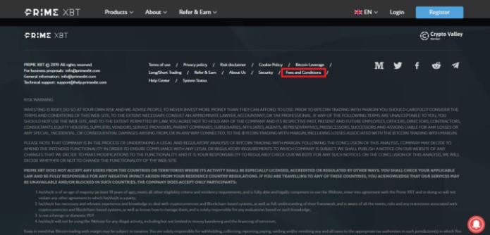 A plataforma não cobra nenhuma taxa de depósito, enquanto sua taxa de retirada é fixada em 0,0005 BTC. Não cobra nenhum cartão ou taxas de transferência bancária, pois não suporta moedas fiduciárias. As taxas de conversão de moeda usando Changelly estão sujeitas à estrutura de taxas de Changelly. Uma lista completa de taxas aplicáveis pode ser encontrada em Página de taxas do PrimeXBT que é facilmente acessível a partir da barra de navegação na parte inferior de cada página.