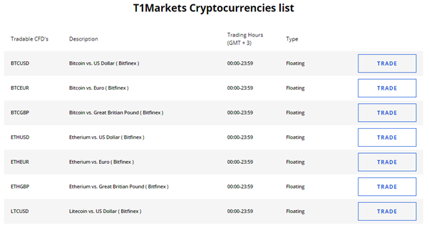 Nos mercados de T1, você pode negociar CFDs de Mais de 30 pares de criptomoedas, incluindo Bitcoin, Ethereum e Litecoin. A plataforma suporta CFDs de negociação de Crypto, mas não permite que você compre ou venda tokens digitais diretamente. Além disso, você não pode negociar derivados usando moedas. Em vez disso, apenas as moedas fiduciárias são aceitas.