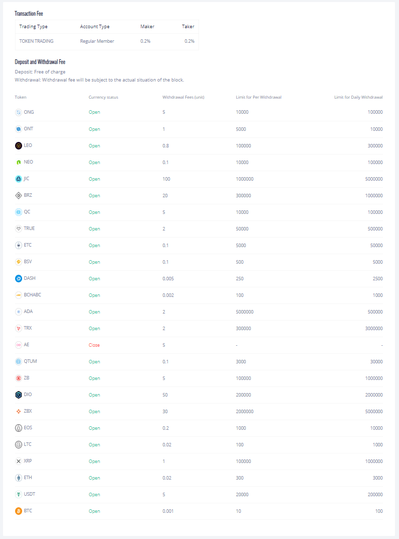 Zbx não cobra taxas para depositar criptomoedas. No entanto, as taxas de retirada variam com base no tipo de criptomoeda e na quantidade de retirada. As taxas oficiais sobre depósitos fiduciárias ainda não são conhecidas e variam no depósito.