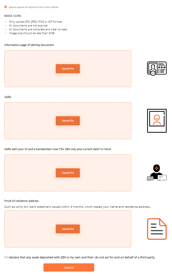 - 2 Imagens de selfie, uma imagem deve ser tirada mantendo a prova de identificação e um papel com uma nota manuscrita "apenas para ZBX" juntamente com a data atual escrita na mesma nota.