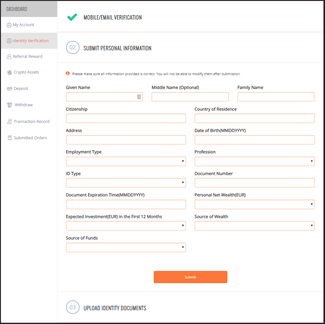 Como o ZBX é uma troca regulamentada, ele oferece muita importância à segurança dos ativos dos clientes e à privacidade das informações pessoais. Portanto, segue -se um Procedimento de verificação estrita Antes de permitir que um indivíduo comece a negociar na bolsa. Além de verificar seu endereço de e -mail e número de celular, você precisa fazer o upload do seguinte: