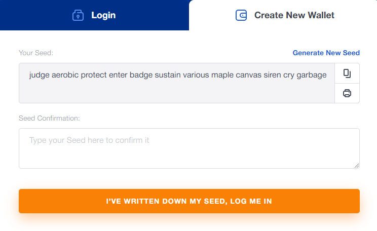 - O site gerará um automático e aleatório Semente de recuperação de 12 palavras. Copie esta frase e armazene -a com segurança, idealmente offline, caso você precise recuperar sua carteira.