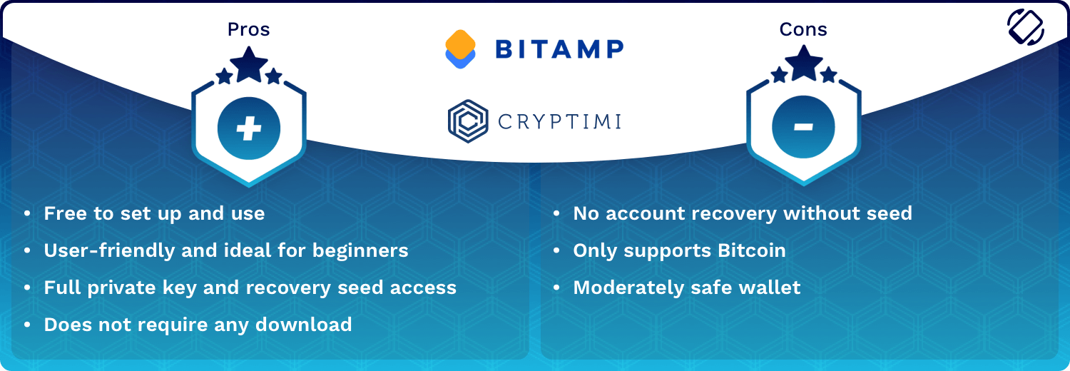 O Bitamp é uma carteira on-line do lado do cliente. Isso significa que é Não é tão seguro quanto as carteiras de hardware, também conhecido como dispositivos de armazenamento a frio. As carteiras on -line são mais fáceis de invadir por criminosos cibernéticos, pois estão sempre conectados à Internet. Por outro lado, os dispositivos de armazenamento a frio gastam a maior parte do tempo offline e não podem ser acessados remotamente.