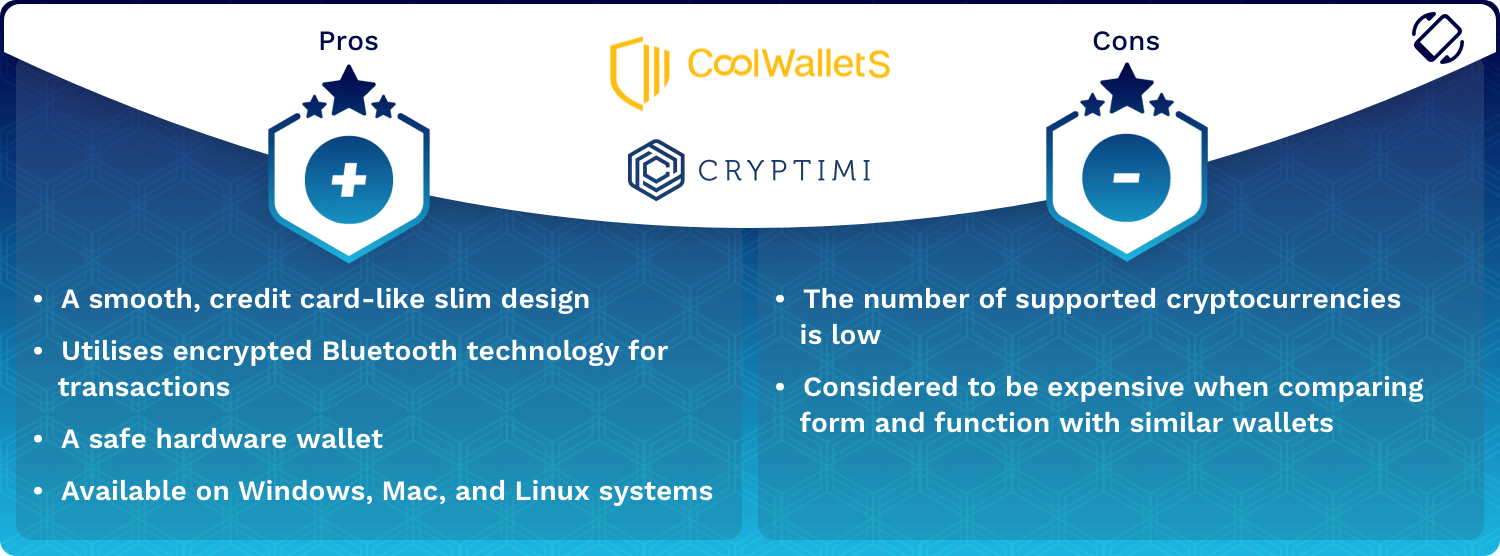 A comunicação entre a carteira e o smartphone é criptografado usando o padrão AES 256, para garantir que as medidas de segurança sejam tomadas. Como ele usa uma senha dedicada para emparelhamento, não é possível que nenhum dispositivo novo ou não autorizado se comunique ou recupere dados da carteira. Além disso, o chip de elemento seguro que segura as chaves particulares é um CC EAL 5+ Certificado S.E. Chipset, que é equivalente ao nível de segurança compatível com FIPS usado em equipamento militar. Como é impossível emparelhar a carteira com dispositivos não autorizados, os fundos dos usuários não estão em risco, mesmo que a carteira seja perdida ou roubada. O CoolWallet S também permite que os usuários autentiquem transações através do Touch ou Face ID, o que protege ainda mais os ativos dos usuários, mesmo que a carteira e o telefone sejam perdidos ou roubados.