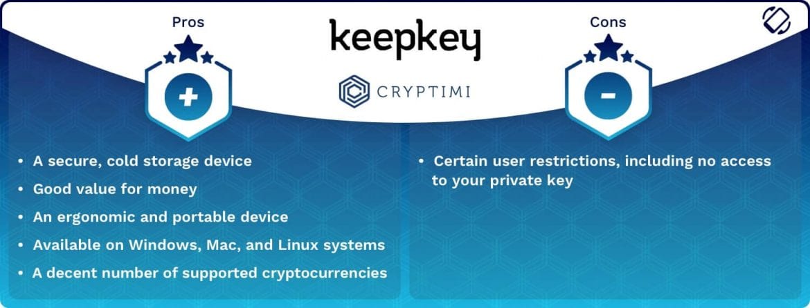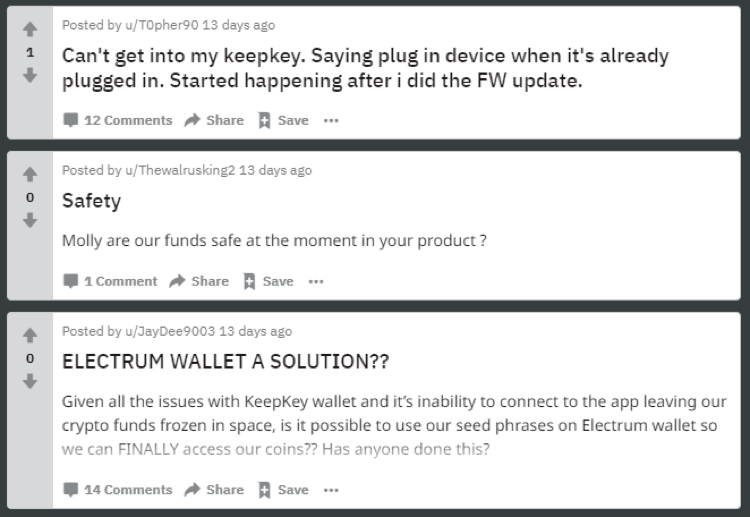 Embora o KeepKey tenha reduzido recentemente seu preço, ele não é tão popular quanto Trezor ou Ledger Nano S. Muitos usuários relataram problemas de conectividade no fórum do Reddit. Além disso, também houve relatos de que o A equipe de suporte ao cliente é relativamente lenta para resolver esses problemas. Além da conectividade, nenhum problema relacionado à segurança foi relatado em mídias sociais ou fóruns on -line. No geral, KeepKey é considerado Uma carteira de hardware segura para armazenar moedas e fichas.