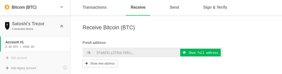 - Clique na guia "Receber" para visualizar o endereço de recebimento na tela. Conecte seu dispositivo Trezor e verifique se o endereço exibido no dispositivo corresponde ao exibido na tela do seu computador. Se você deseja visualizar o endereço como um código QR, clique no QR no seu dispositivo. O código QR para o endereço será exibido no computador e no dispositivo Trezor.