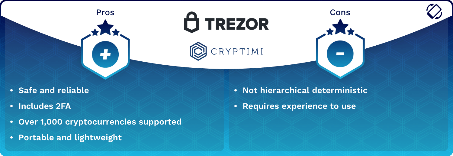 A carteira de Trezor é uma das carteiras de hardware mais seguras acessível. Desenvolvido pelo Satoshi Labs, a Trezor é na verdade composta de dois modelos de carteira diferentes; Tesouro um e Modelo seguro T.. A principal diferença entre as duas variações é que Modelo seguro T. faz uso de uma tela sensível ao toque para suas operações, enquanto o Tesouro um usa dois botões físicos. Trezor foi a primeira carteira de Bitcoin usada para manter as criptomoedas no armazenamento offline.