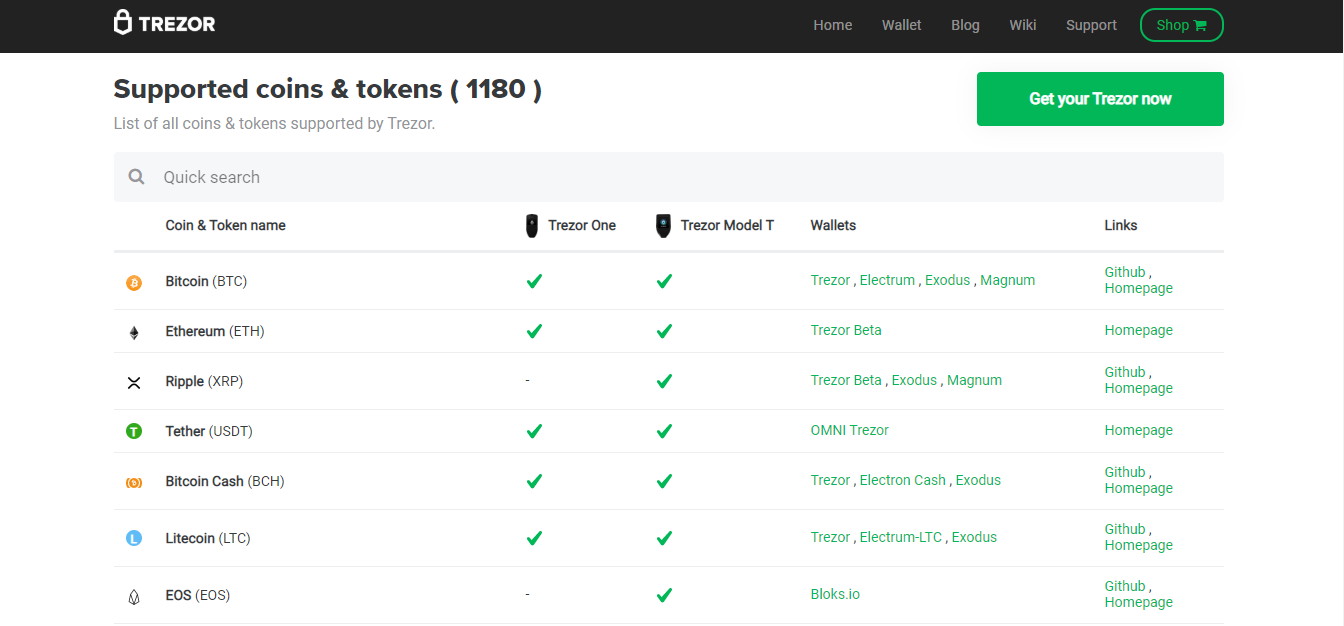 Para ver a lista completa e atualizada de moedas e tokens suportados pela Trezor Wallet (ambos os modelos), clique aqui.