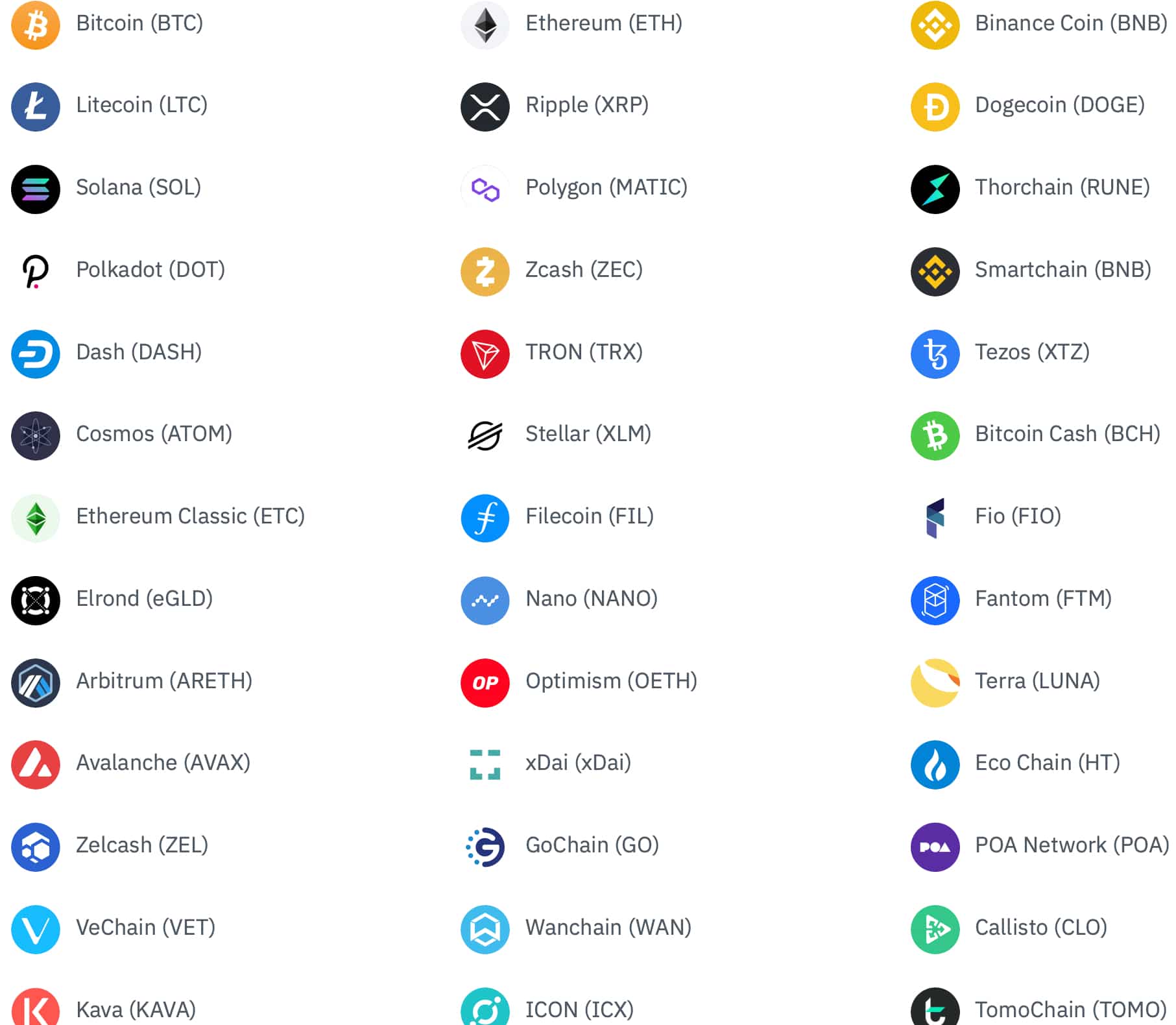 Levaria muito tempo para listar todo o catálogo de criptomoedas suportadas nesta revisão da carteira de confiança. Algumas das moedas e tokens mais proeminentes incluem: