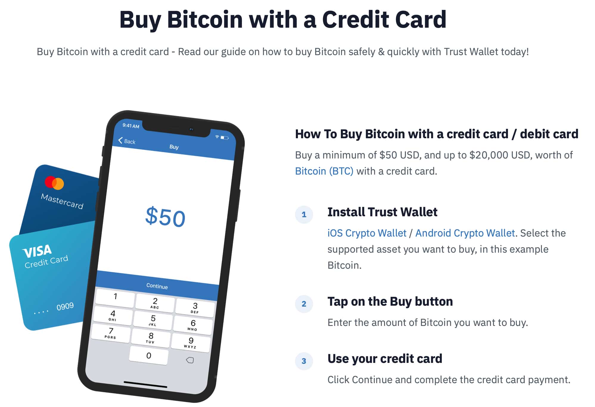Você pode Compre um mínimo de US € 50 em bitcoin ou outras criptomoedas suportadas diretamente da sua carteira de confiança. A carteira utiliza uma troca descentralizada que opera na rede Kyber.