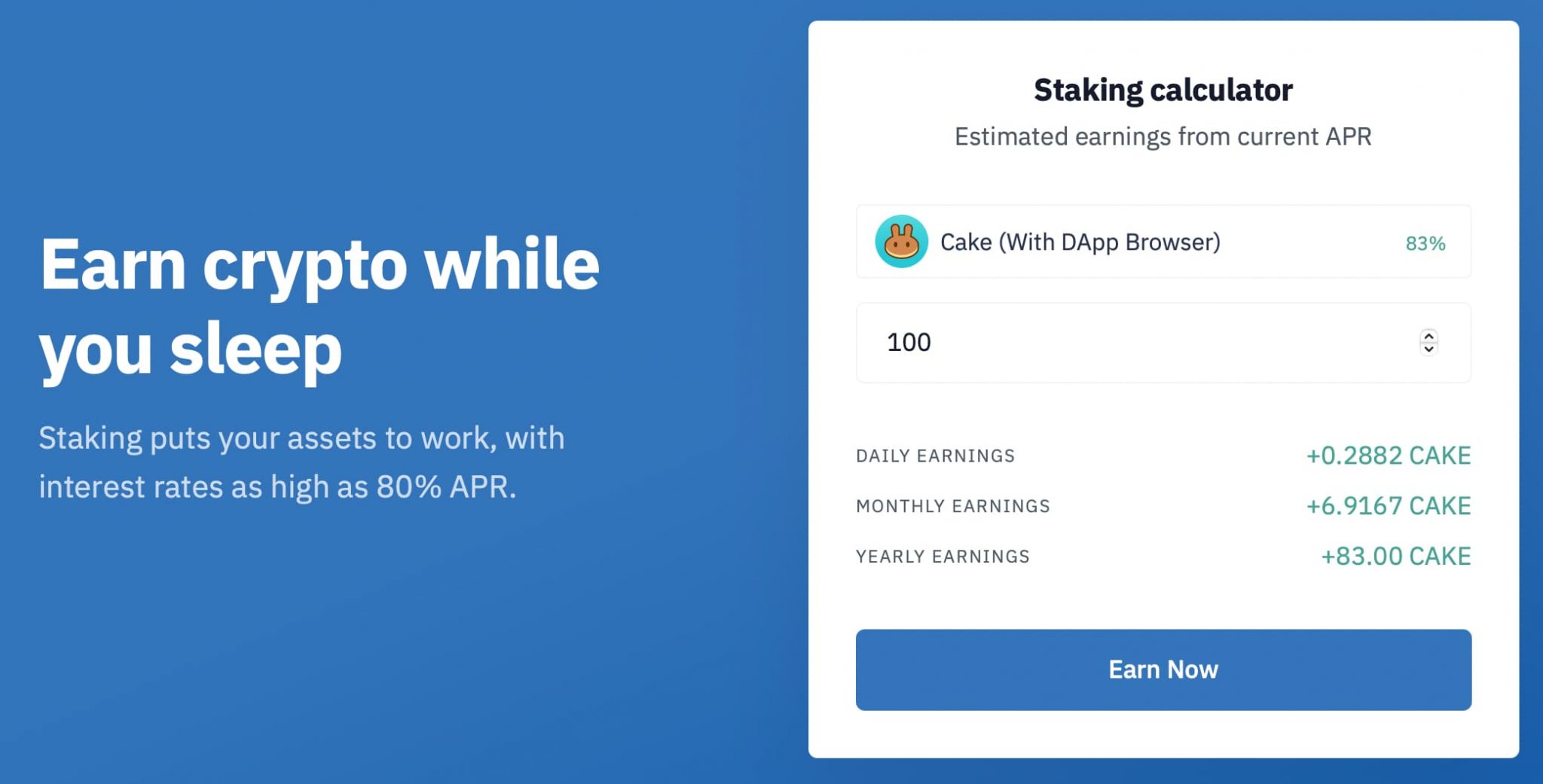 A Wallet Trust possui uma extensa seleção de moedas e tokens suportados. Moedas populares, como a Binance Coin (BNB), podem fornecer um retorno entre 7% e 30%. Enquanto isso, se você apostar em panquecas (bolo), você pode Obtenha até 80% de APR.