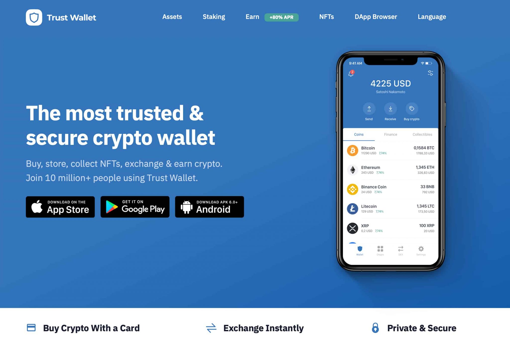 A carteira de confiança é uma carteira móvel grátis Isso foi comprado pela maior troca de criptomoedas do mundo, Binance. A carteira quente fácil de usar permite comprar bitcoin e altcoins, além de armazenar mais de um milhão de ativos. Esta carteira não custodial oferece uma variedade de recursos impressionantes, incluindo a possibilidade de apostar suas moedas e ganhar juros, além de acessar aplicativos descentralizados (DAPPs).