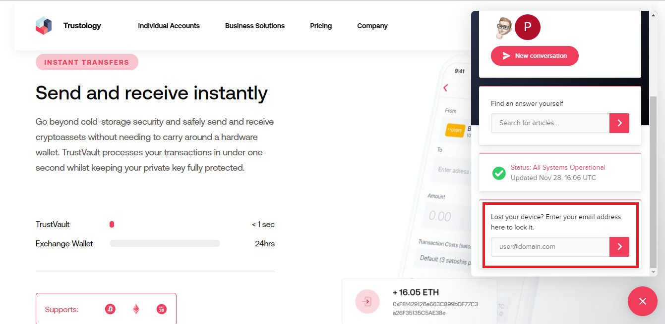 Tão logo Como você percebe que seu telefone está faltando, Assim, umassim, Assim, Visite confiança e abra o botão de bate -papo ao vivo. Na parte inferior da janela de bate -papo, você encontrará uma caixa "Lost Your Device", onde pode inserir seu endereço de e -mail registrado. Em seguida, você deveria: