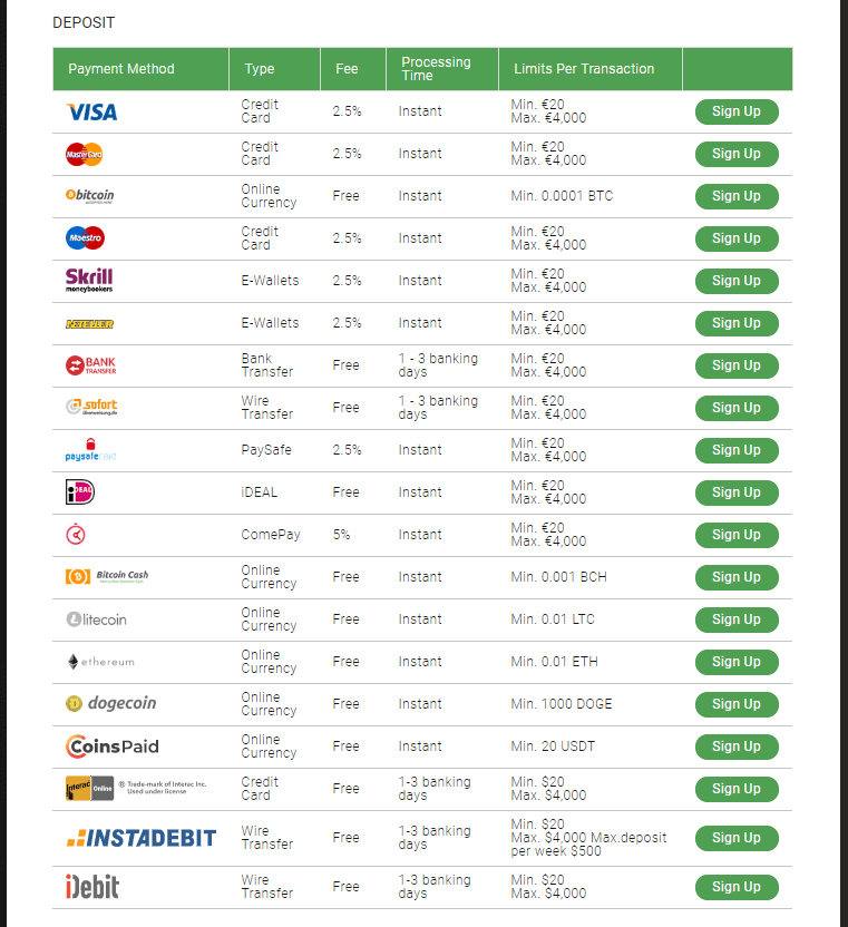 Do O valor mínimo do depósito é de US € 20 Para a maioria das opções de depósito e 0,0001 BTC para Bitcoin e 0,001 BCH para depósitos em dinheiro de Bitcoin.