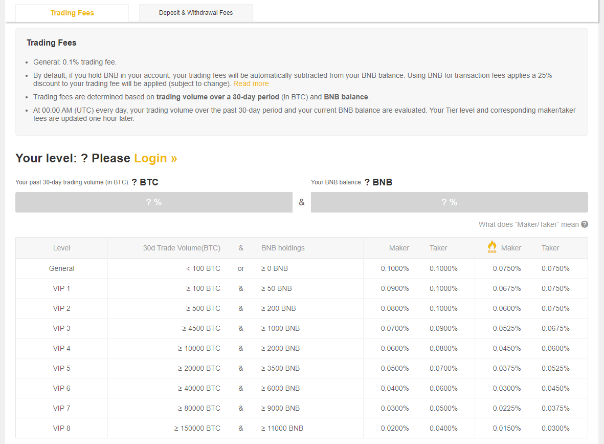 As taxas da bolsa de valores também são muito competitivas. Os usuários que têm em criptomoeda BNB se beneficiam de taxas mais baixas. O BNB foi vendido em 2017 como parte da OIC By Binance. O BNB agora pode ser comprado e vendido via Binance. Para fabricante de mercado, ou seja, revendedores que estabelecem ordens limitadas que fornecem a liquidez urgentemente necessária, as taxas são mais baixas. Os compradores de mercado são comerciantes que alcançam o melhor preço possível em um determinado momento e, portanto, reduzem a liquidez.