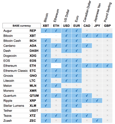 Outra bolsa de valores que oferece negociação de margem é Kraken. Kraken suporta moedas fiduciárias importantes, como EUR, USD e EUR, para que os revendedores possam especular com suas moedas fiduciárias com suas moedas fiduciárias. A maioria das trocas de criptomoedas que lidam com moedas fiduciárias não serão grandes Seleção de moedas antigas suportadas. Kraken é uma exceção e suporta um número considerável de casais altcoin que estão listados na tabela a seguir.