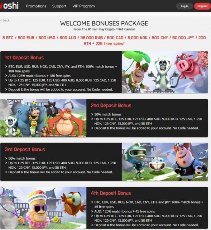 Atualmente, o Oshi Casino aceita apenas a criptomoeda de bitcoin. Os limites de pagamento são extremamente vantajosos e adequados para a maioria dos métodos de pagamento. Além disso, eles estão sujeitos ao depósito Sua conta no BTC Nenhum limite máximo de depósito.