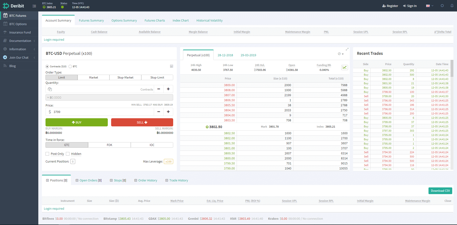 Enquanto o BitMex investiga o Altcoins, o Deribit se concentra apenas no Bitcoin. Há um contrato futuros perpétuos para o Bitcoin e também os contratos que expiraram trimestralmente. As taxas para o contrato perpétuo são de 0,075% para compradores de mercado e um desconto de 0,025% para os fabricantes de mercado. o As taxas para contratos trimestrais são de 0,05% para compradores de mercado e um desconto de 0,02% para fabricantes de mercado. As taxas de opções são 0,04% do contrato subjacente ou 0,0004 BTC por opção.