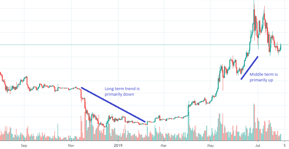 O movimento primário em qualquer gráfico de criptografia mostra uma grande tendência que poderia durar pouco menos de um ano a qualquer número de anos. Esse movimento é chamado de tendência otimista (para cima) ou de baixa (para baixo). Dentro desse movimento primário, geralmente existem várias mudanças menores, que são reações de mercado de curto prazo que podem durar dias ou até meses. Chamadas de balanços médios, esses movimentos normalmente variam entre 33% a 66% da mudança de preço primário.